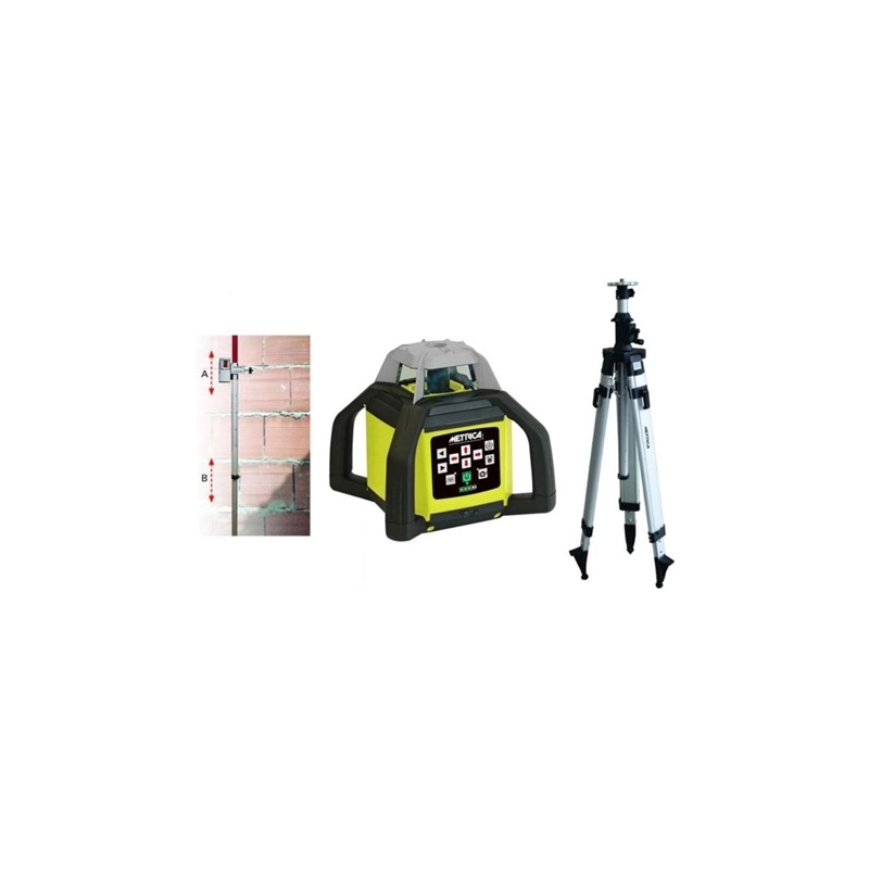 Kit composto da: 1 laser 61395, 1 asta telescopica da 2,4 mt e 1 treppiedi regolabile tra 95 e 195 cm con attacco 5/8''. Laser rotante con telecomando e ricevitore. Portata 500 mt con ricevitore. Funzioni: piano orizzontale, verticale, scanner, tilt, inclinazioni manuali assi X e Y. Batterie ricaricabili NiMH. IP66. Laser 638 nm (Classe 2). Precisione orizzontale 1mm/10 m, verticale +/-5 mm/30 m