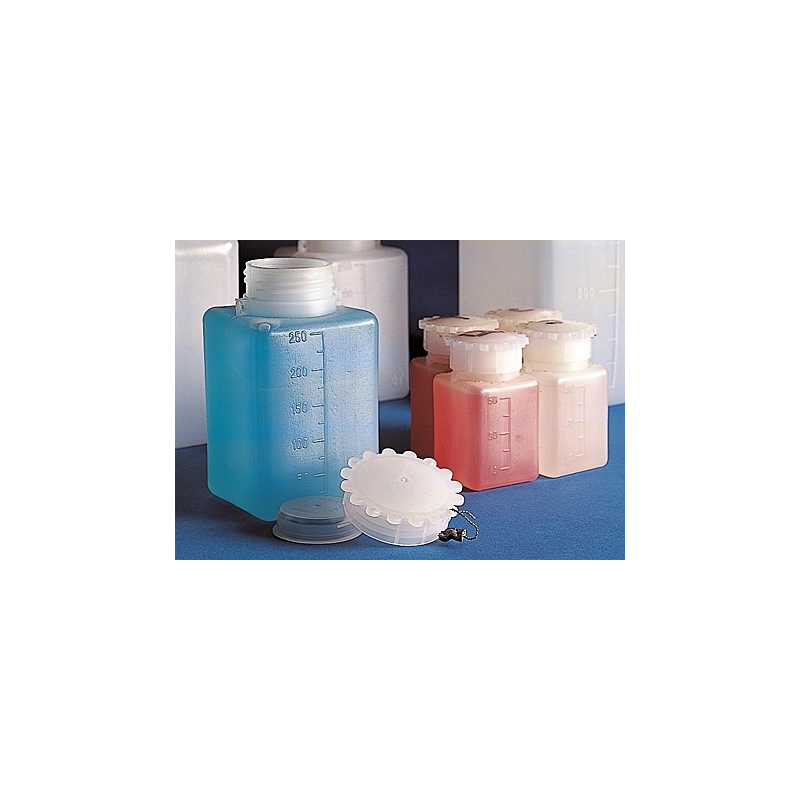 Bottiglie rettangolari graduate utili per conservare prodotti e campioni con il minimo consumo di spazio. Corpo in PE, tappo in PP. Modello = capacita' ml/dimensioni mm