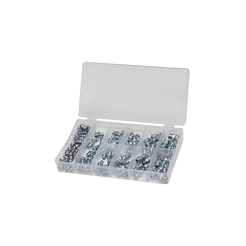 Assortimento 110 ingrassatori. Tipologia: diritti 4 misure, angolari 45 gradi 3 misure, angolari a 90 gradi 3 misure.