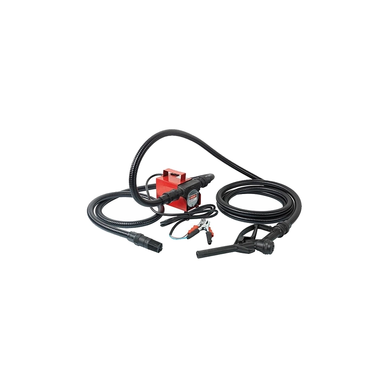 Elettropompa autoadescante con motore 12 V in corrente continua con magneti permanenti. Potenza 0,5 HP. Aspirazione: tubo flessibile anellato da 2 m di diametro 22 mm con raccordo e valvola di fondo in plastica montati. Portata: tubo flessibile anellato da 4 m di diametro 22 mm con raccordi montati e una pistola in plastica. Portata 44 l/min.