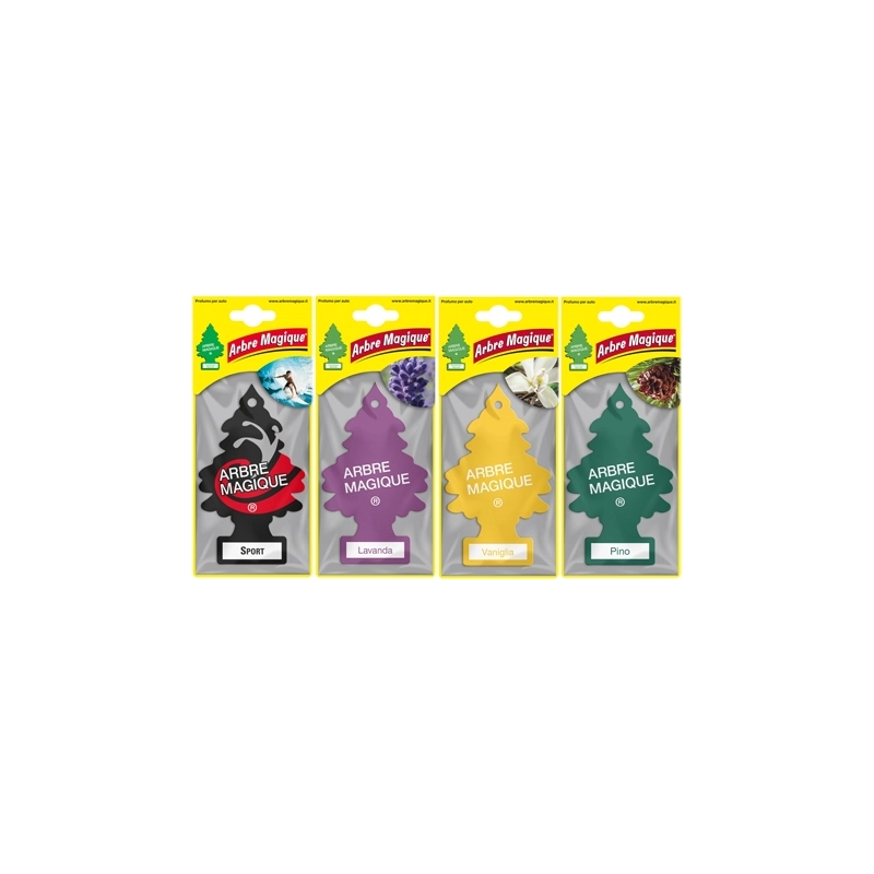 Arbre magique appendibili per automobili. Durata 7 settimane. Disponibili in singola fragranza oppure in espositore misto da banco da 48 pz. Modello = fragranza
