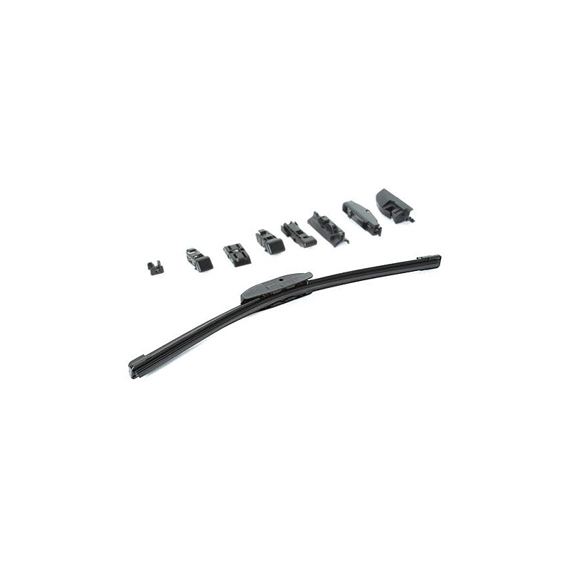 Spazzola tergi professionale universale per vetri anteriori. Corpo in plastica con arco in acciaio armonico. Gomma di prima qualita' Dupont. Completo di kit di 12 adattatori per una completa copertura del parco auto. Applicazione facile ed immediata. Modello = lunghezza mm
