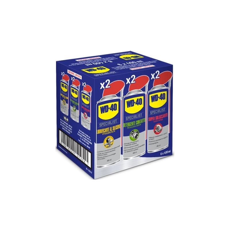 Confezione composta da 6 bombolette WD40 Specialist: 2 lubrificante al silicone da 400 ml, 2 detergente contatti da 400 ml e 2 super sbloccante da 400 ml