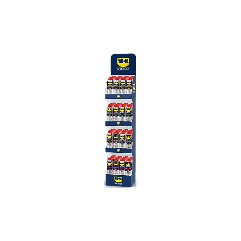 Espositore composto da: 12 bombolette lubrificante al silicone da 400 ml, 12 bombolette detergente contatti da 400 ml, 12 bombolette grasso spray da 400 ml e 12 bombolette super sbloccante da 400 ml.