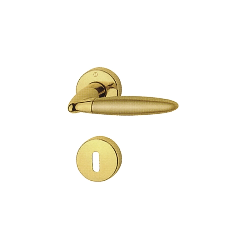 In ottone massiccio con molla di richiamo e quadro a profilo da mm.8. Abbinamento di finitura lucida e satinata. Modello = tipo foro chiave/finitura
