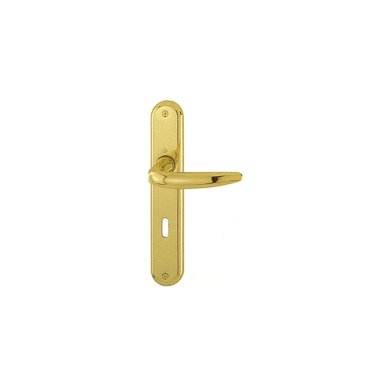 In ottone massiccio con molla di richiamo e quadro a profilo da mm.8. Finitura ottone lucido 'resista', inattaccabile dai graffi e dagli agenti atmosferici. Modello = distanza da foro maniglia a foro chiave mm./tipo foro chiave