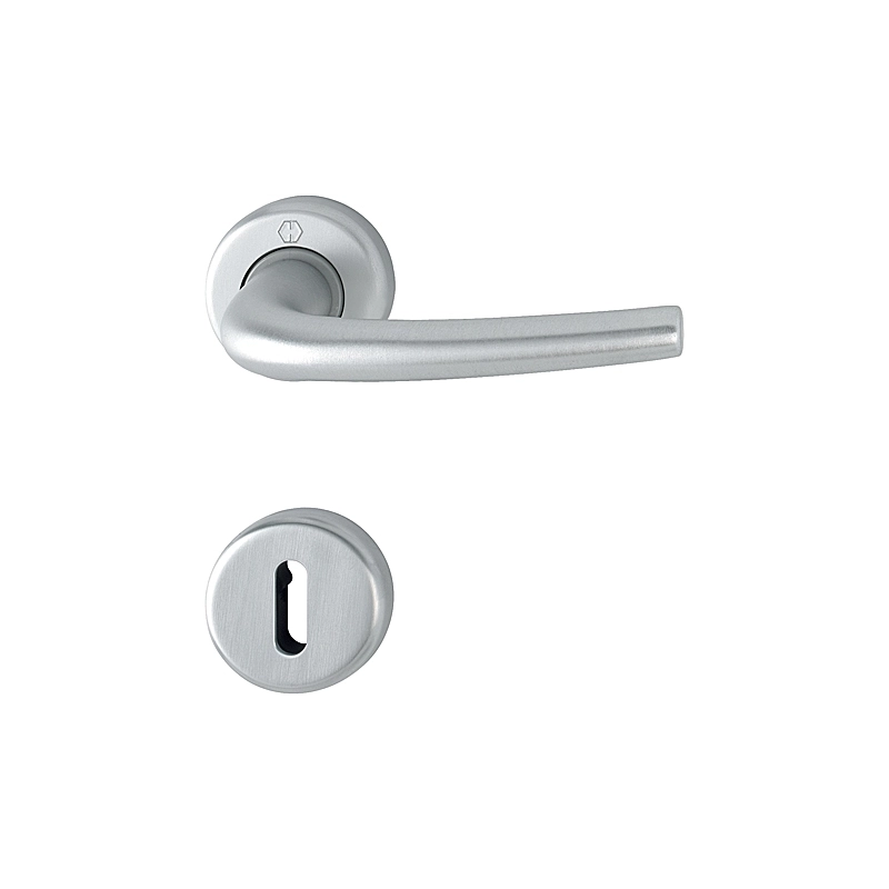 In alluminio con molla di richiamo, sottorosette in resina e quadro a profilo da mm 8. Modello = tipo foro chiave/finitura