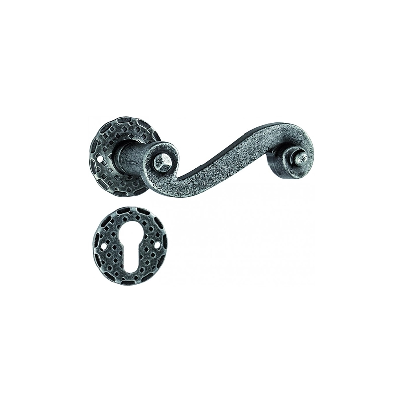 Maniglia con rosetta e bocchetta, con molla di ritorno. Color argento. Modello = tipo foro