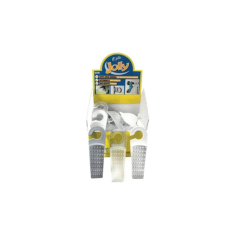 Fermaporte in pvc morbido a cuneo con gancio per essere appeso alla maniglia della porta. Fornito in espositore da banco contenente 20 fermaporte di colori assortiti (grigio, bianco, trasparente). Dimensioni 130x40 mm