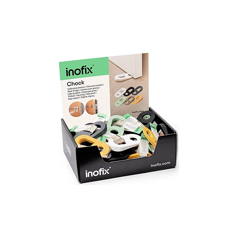 Espositore formato da 42 fermaporte in gomma di colori assortiti. Dimensioni singolo fermaporte 15x94x46 mm. 3 funzioni: cuneo fermaporte, salvamaniglia e salvamuro. Riponibile comodamente sulla maniglia
