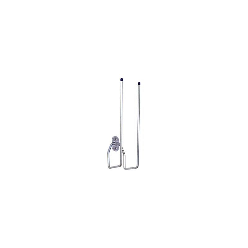 In acciaio zincato tondo pieno diametro mm 9.Con posizione di riposo e blocco di sicurezza. Distanza tra le braccia mm 100. Punte rivolte verso l'alto per mm 390. Sporgenza mm 80
