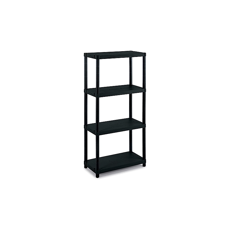 Scaffale in plastica caricata a 4 ripiani con piedini regolabili. Adatto per interni ed esterni. Portata massimo del ripiano 25 kg. Dimensioni 60x30x132h cm. Certificato TUV e GS.