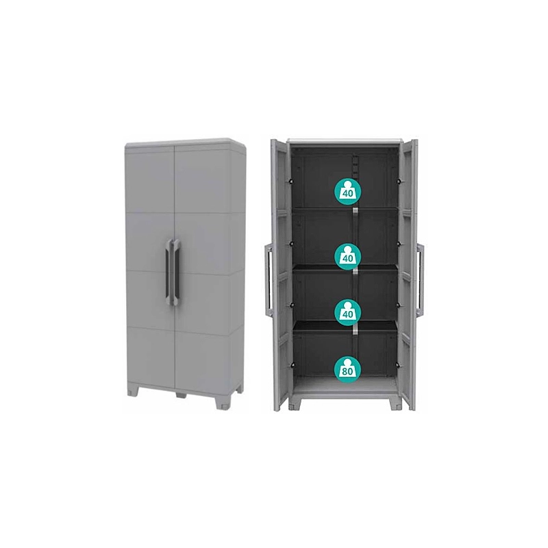 Armadio con cerniere in metallo che facilitano l'apertura e la chiusura delle ante. Maniglia in materiale bicomponente. Piedi regolabili in altezza. 3 ripiani interni modulari, utilizzabile anche come portascope. Ideale anche per esterni. Resiste a temperature comprese tra i -5 e i +40 gradi. IP43. Protezione ai raggi UV. Dimensioni 78x43,6x184,4h cm