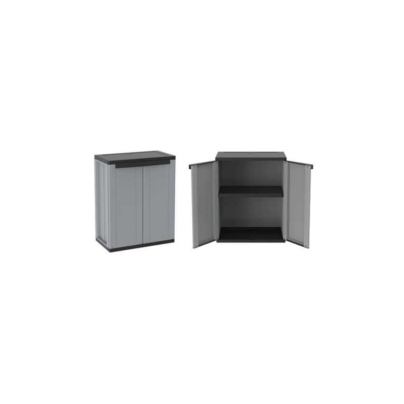 Armadietto in plastica a due ante con un ripiano interno regolabile, colore grigio-nero. Dimensioni (LxPxH) mm 680x375x850