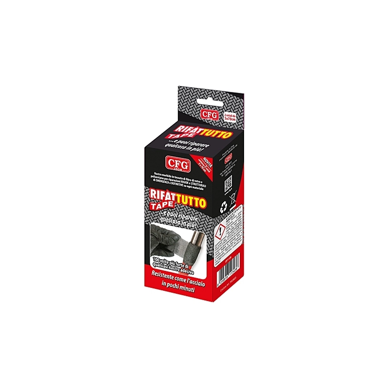 Nastro in fibra di vetro e poliuretano adesivo, per riparazioni rigide e strutturali di emergenza o definitive. Aderisce e si incolla su qualsiasi materiale: metalli, ghisa, legno, vetro, pietra, marmo, plastica, gomma, PVC, nylon, ecc. Resistente fino a 150 gradi. Dimensioni 5x70 cm. Incluso nella confezione 2 nastri, 1 paio di guanti e carta abrasiva.