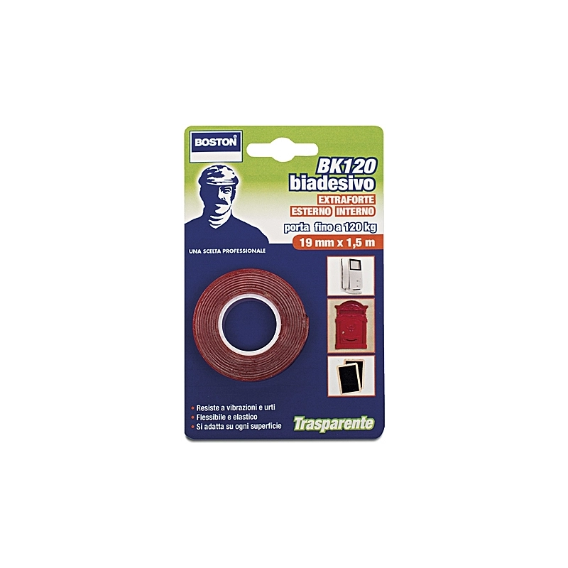 Nastro biadesivo trasparente con forte tenuta. Idoneo per applicazioni all'esterno e all'interno. Ideale per il fissaggio di legno, plastica, piastrelle e vetro. Dimensioni mm 19x1,5 mt. Trasparente.