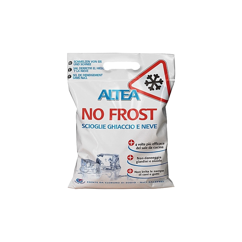 Sciogli ghiaccio e sciogli neve in grado di sciogliere una quantita' di ghiaccio 4 volte superiore a quella comunemente sciolta dal sale tradizionale utilizzato ad uso stradale (cloruro di sodio). Non danneggia giardini, aiuole e cemento. Puo' essere impiegato sia per prevenire la formazione di ghiaccio sia per eliminarlo in seguito a precipitazioni nevose. In confezione da 5 kg.