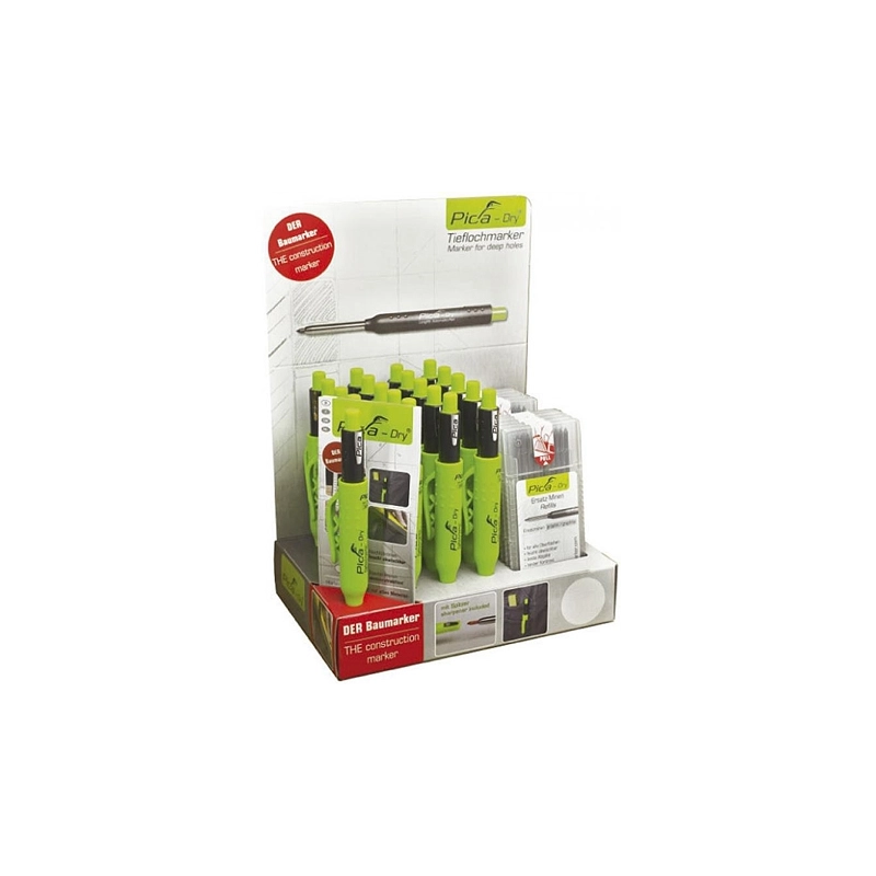 Espositore composto da 20 matite Pica Dry con mine speciali in grafite e 10 confezioni da 10 mine universali ricambio per Pica Dry.