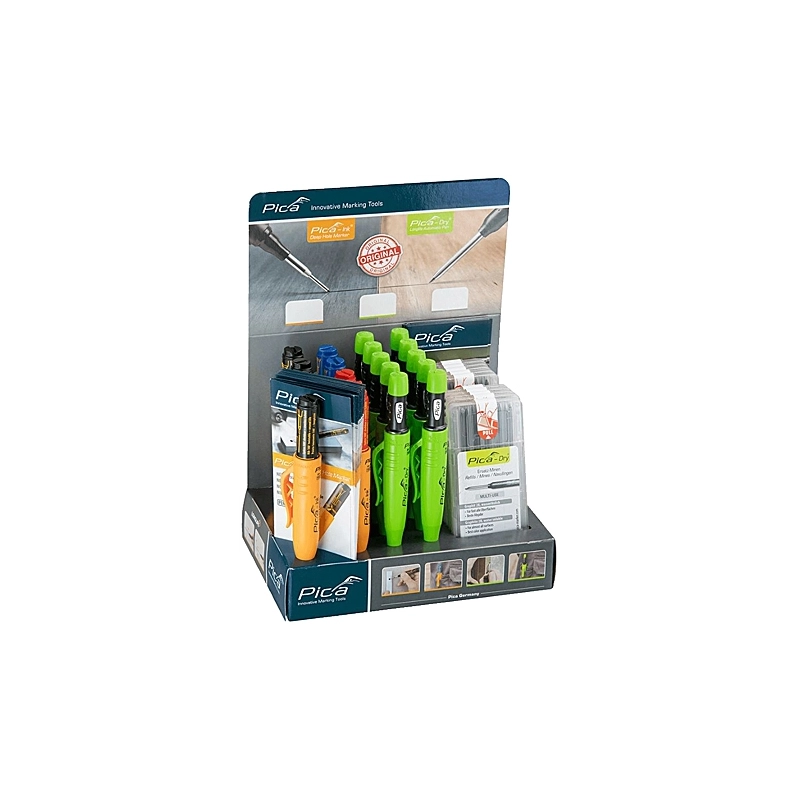 Espositore composto da 10 matite Pica Dry con mine speciali in grafite e 10 confezioni da 10 mine universali ricambio per Pica Dry, 5 pennarelli PicaInk neri, 3 PicaInk rossi e 2 PicaInk Blu.