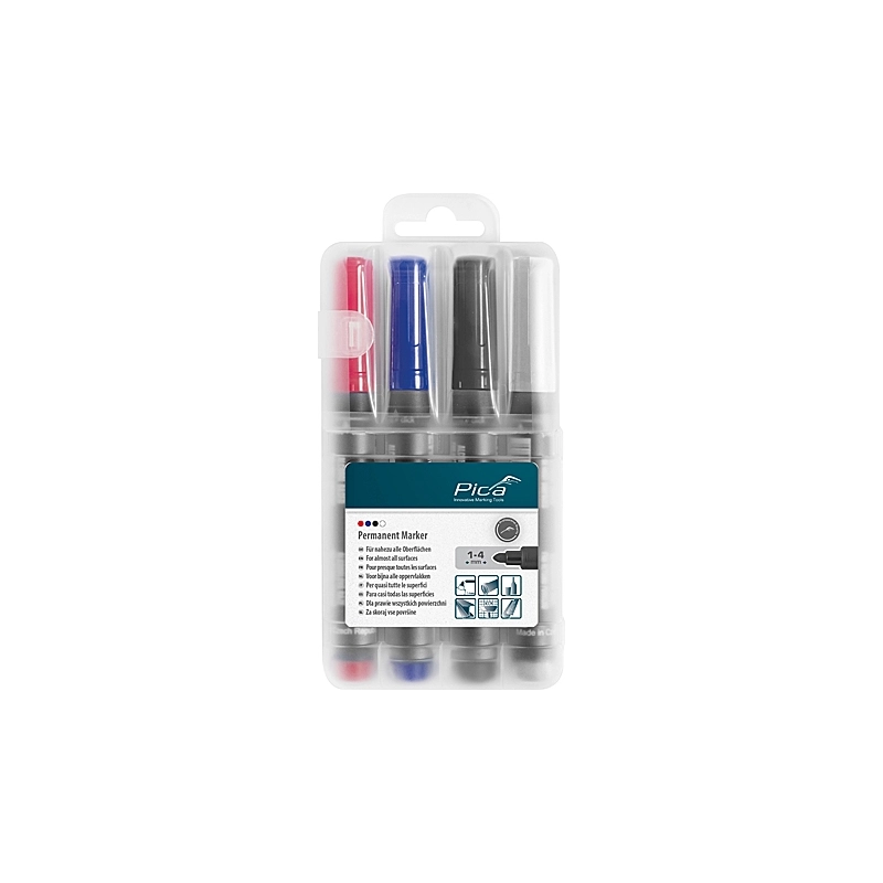 Set 4 marcatori indelebili con punta tonda. Colori: rosso, blu, nero, e bianco. Punta del marcatore 1-4 mm. Indelebile e anti-sbavatura dopo circa 5 secondi. Per marcature su quasi tutte le superfici.