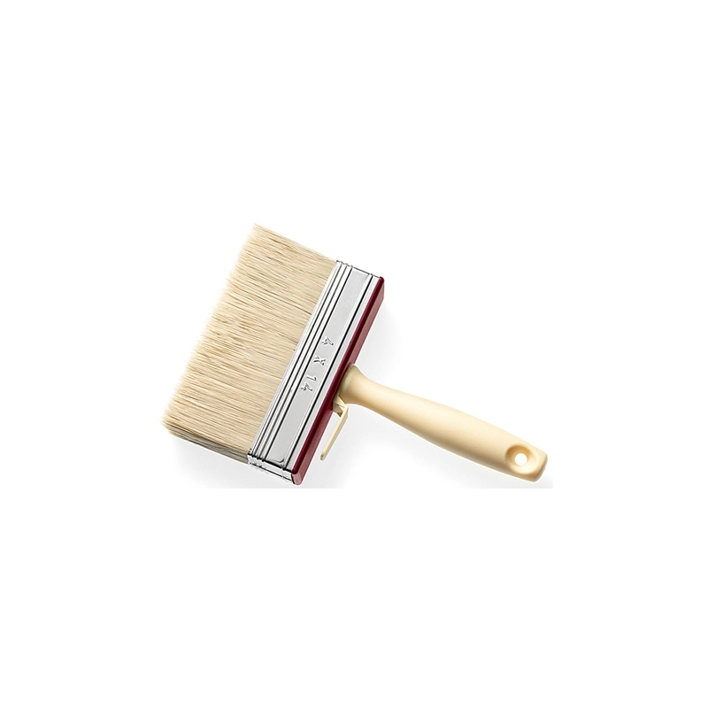 In setola bionda mista, montatura plastica, ghiera nichelata. Adatto per idropitture e smalti. Modello = dimensioni mm