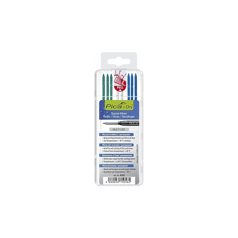 Mine universali resistenti all'acqua. Ideali per il taglio a umido di piastrelle e pietra. Senza cloruri. Lunghezza della mina 125 mm, diametro 2,8 mm. Confezione da 8 pezzi (3 blu, 2 bianche e 3 verdi)