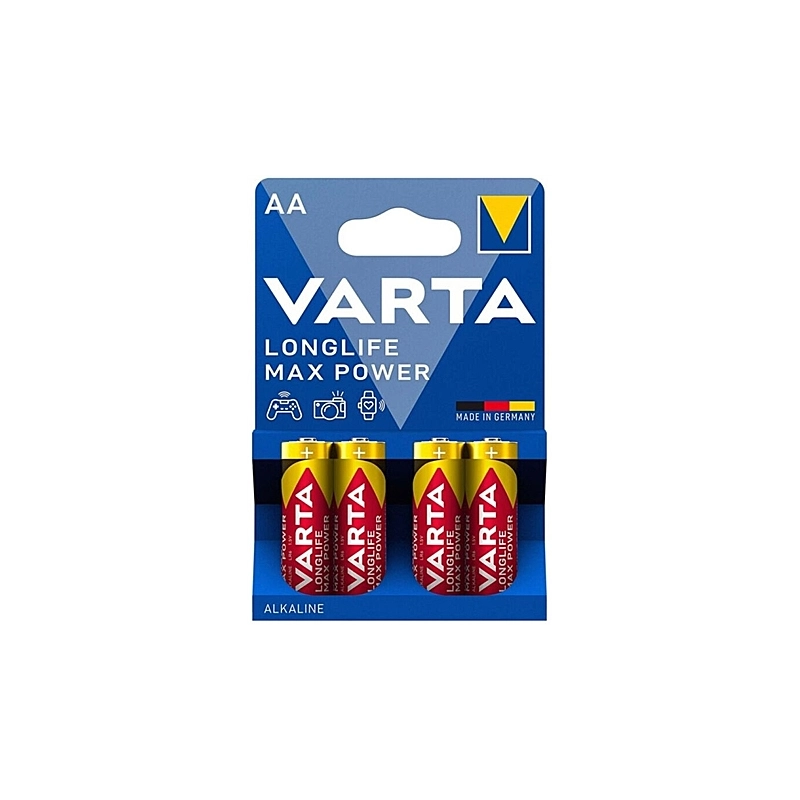 Blister 4 batterie AA, Alcalina Longlife Max Power Stilo. Massima potenza per dispositivi digitali e strumenti che necessitano di un'energia precisa e di lunga durata. Carica in stoccaggio garantita per 10 anni.