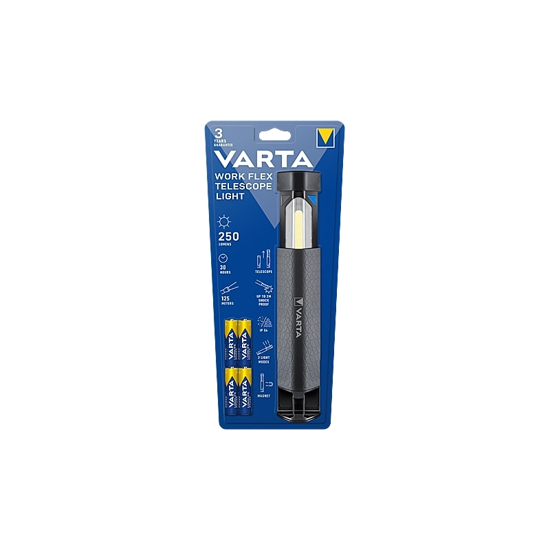 Torcia a led resistente agli urti, IP54. Tecnologia COB LED. Luce frontale o diffusa ad estrazione telescopica. Molteplici opzioni di fissaggio: appeso, in appoggio oppure con magnete per lavorare a mani libere. Manico rivestito in gomma antiscivolo. Fascio luminoso fino a 125 mt. Durata fino a 30 ore. 250 Lumen. Funziona con 4 batterie AA incluse.