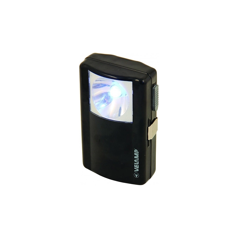 Torcia piatta da 0,5 Watt. 40 Lumen. Funziona con 1 batteria piatta da 4,5V 3LR12. Con gancio appendibile.