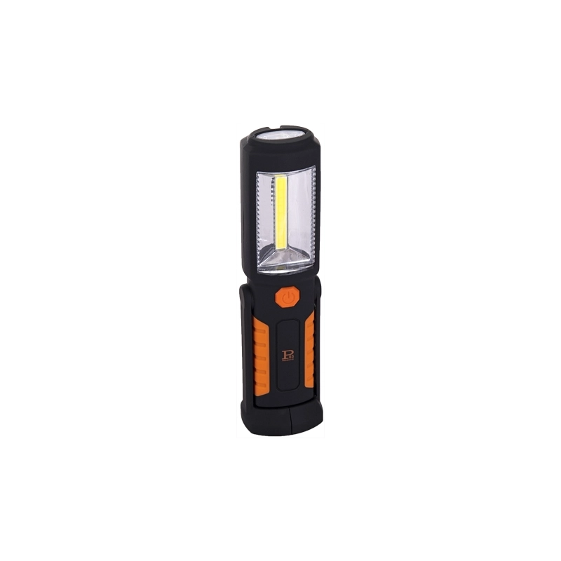 Torcia a Led con corpo bicomponente resistente agli urti. 2 fasci di luce uno laterale diffuso ed uno frontale concentrato. Tecnologia COB, potenza 2 Watt. Dotata di magnete per il fissaggio rapido. 180 Lumen. Funziona con 3 batterie AAA comprese.