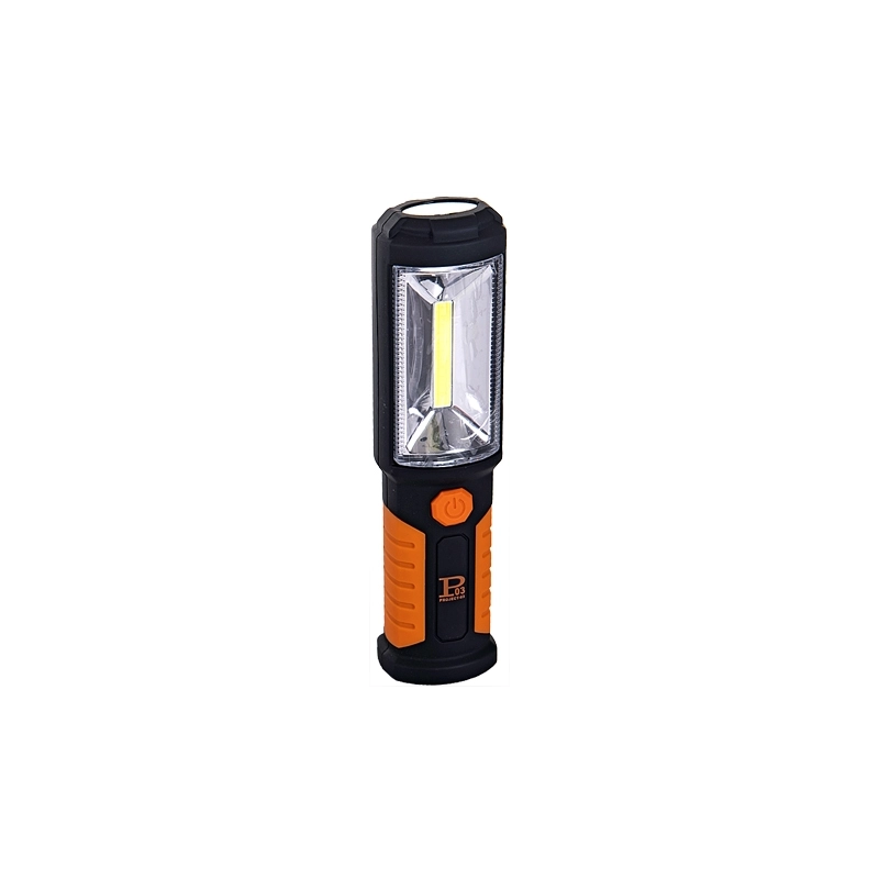 Torcia a Led con corpo bicomponente resistente agli urti. 2 fasci di luce uno laterale diffuso ed uno frontale concentrato. Tecnologia COB, potenza 3 Watt. Dotata di magnete per il fissaggio rapido. 280 Lumen. Funziona con 3 batterie AA comprese.