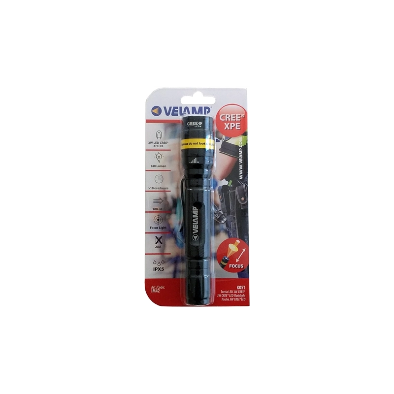 Torcia a Led in alluminio 3W, 140 Lumen. Luce regolabile. Lunghezza cm 15,5. Resistente all'acqua IPX5. Funziona con 2 batterie AA non incluse.