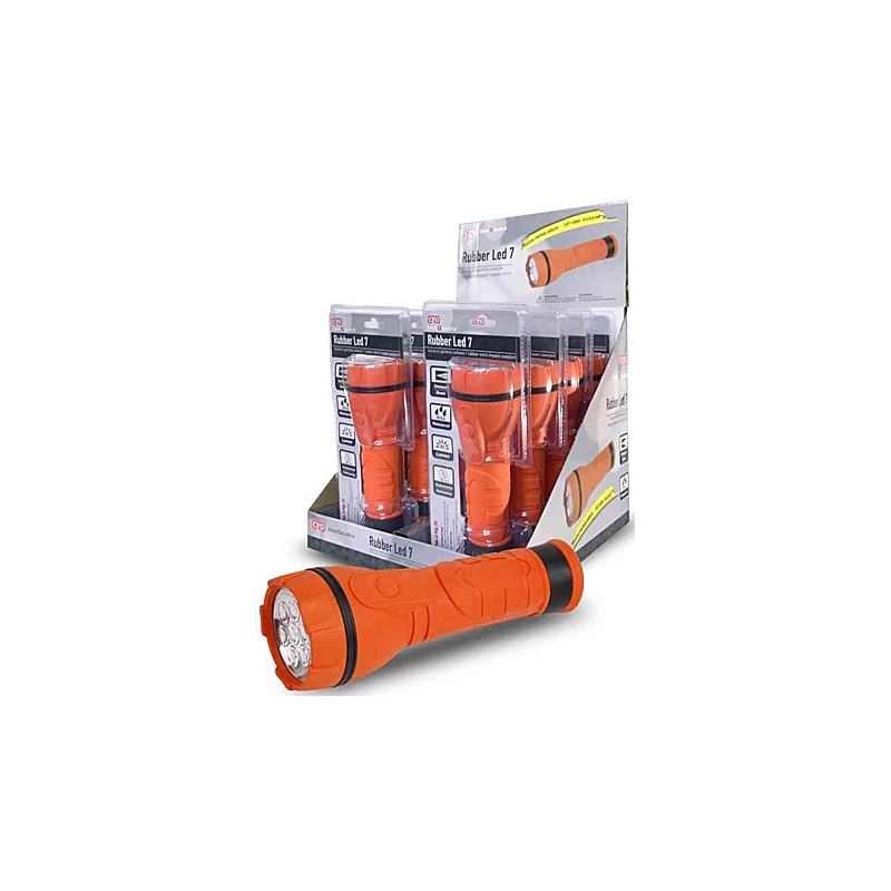 Torcia in TPR a 7 Led colore bianco. 60 lumen. Autonomia 180 ore. IPX4. Funziona con 2 batterie D (non incluse). Dimensioni diametro 7 cm x lunghezza 20 cm.