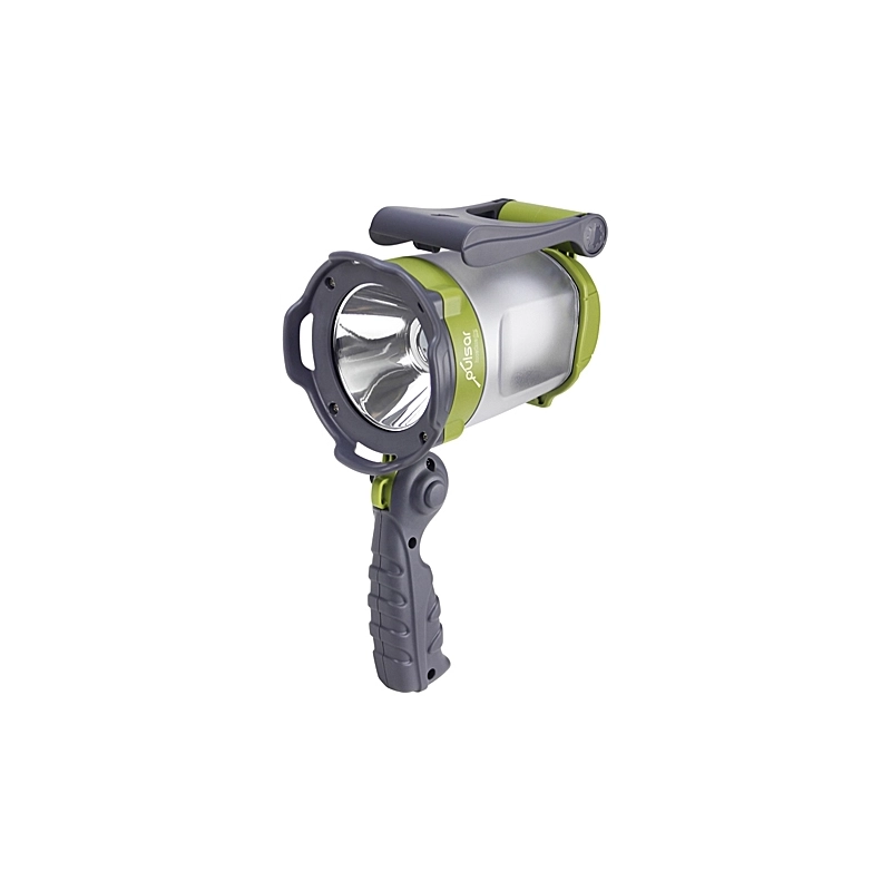 Lanterna in ABS con batteria al litio ricaricabile tramite cavo USB incluso. 10 Watt. Manico regolabile fino a 90 gradi. IP44. 3 tipi di luce: luce concentrata ad alta intensita', luce diffusa fissa 360 gradi e luce lampeggiante. Portata 600 mt. Funzione power bank 2400 mAh. Dimensioni 16,2x11,7x16,5h cm.