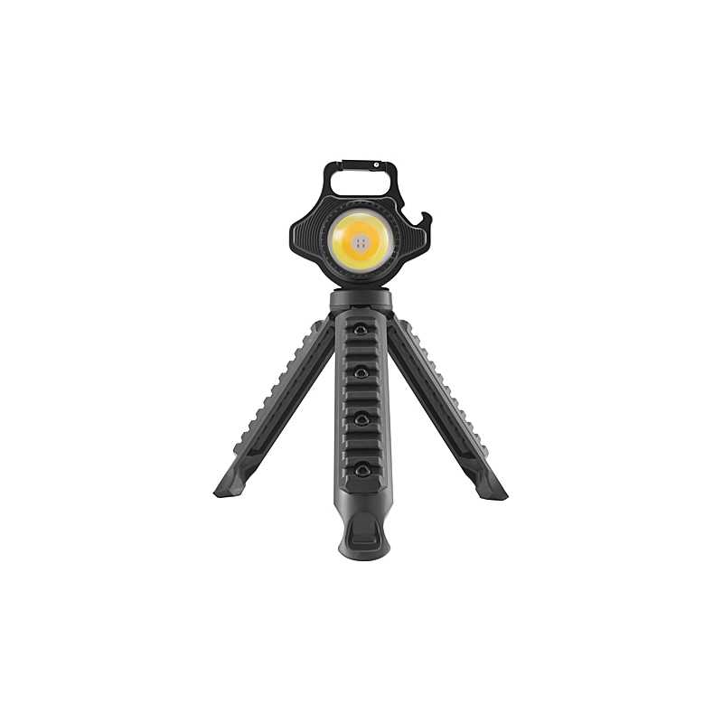 Torcia portatile ricaricabile COB LED. 5 Watt. IP44. Funzioni: luce fredda (440 - 160 lumen) - luce calda (500 - 200 lumen) - luce calda + fredda 700 lumen - luce rossa - luce rossa intermittente. Accessori: supporto treppiede altezza 14 cm provvisto di filetto per fissaggio torcia, supporto magnetico posteriore, inserto apri bottiglie.