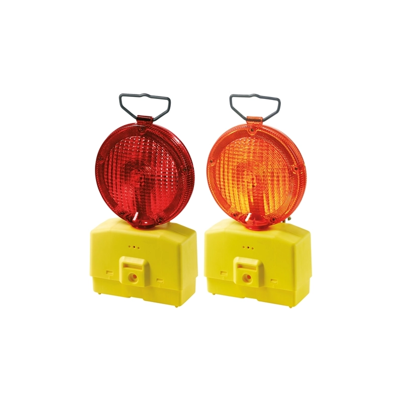 Lampeggiatore stradale a LED con alloggio per 2 batterie 4LR25. Dotato di interruttore crepuscolare e morsetto per ponteggi. Fornito senza batterie. Modello = colore luce