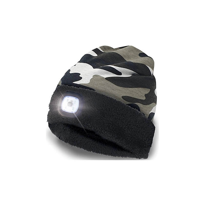 Berretto con luce LED frontale. 100 Lumen. 3 step di luminosita' (100% dura circa 10 ore, 50% dura circa 15 ore, 25% dura circa 20 ore). Ricaricabile tramite USB. Adatto per campeggio, jogging e lavoro. Colore mimetico.