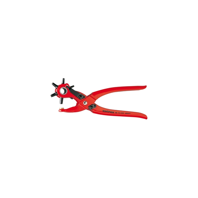 Corpo pinza e fustelle in acciaio speciale, temperato ad olio. Con molla di ritorno e nottolino di arresto. Con 6 fustelle intercambiabili diametro 2 / 2,5 / 3 / 3,5 / 4 / 5 mm.