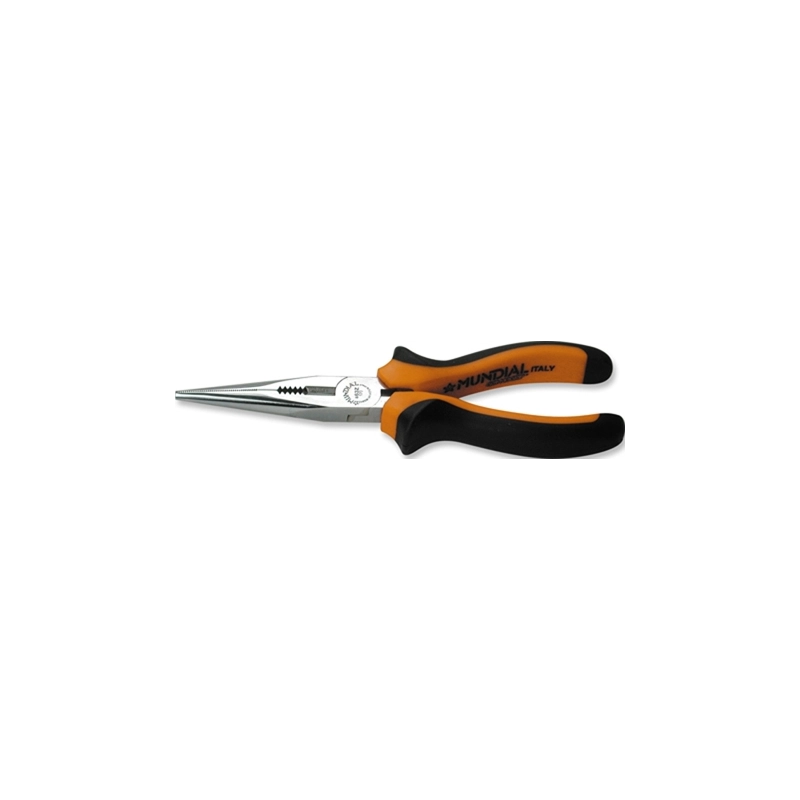 Pinza con becchi mezzitondi lunghi diritti in acciaio cromo-vanadio finitura cromata. Impugnatura bicomponente in gomma-pvc. Modello = lunghezza mm
