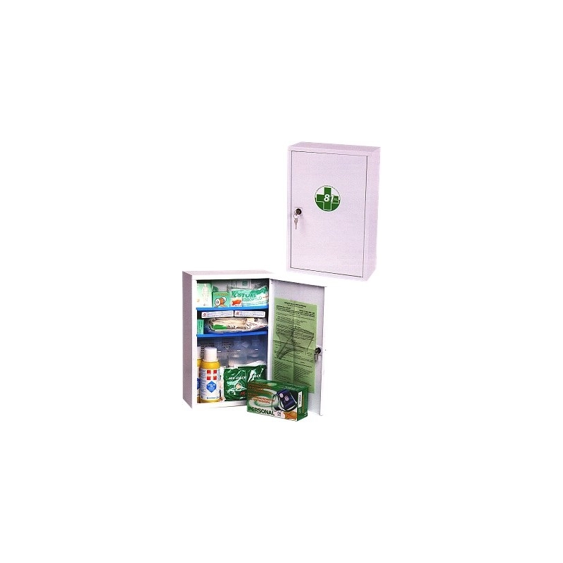 Armadietto in metallo verniciato bianco con serratura a chiave. Dimensioni mm.460x300x140. Contenuto conforme all'art. 1 del D.M. 388/2003.ALL.1. Per piu' di 2 lavoratori.