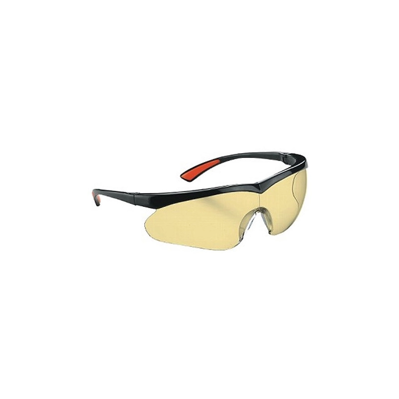 In policarbonato, struttura nera avvolgente con inserti in gomma siliconica, lenti gialle. Con trattamento antigraffio e antiappannante.