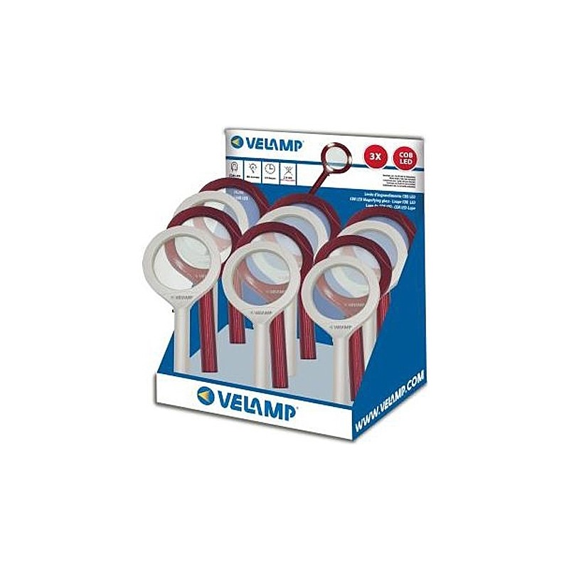 Lente ingrandimento in abs 3X con 3 COB Led. 80 lumen. Autonomia 10 ore. Potenza 1,5 Watt. Funziona con 2 pile AA (non incluse). Dimensioni 24x11x2 cm. Peso 154 gr. In espositore da 12 pz (6 rosse e 6 bianche).
