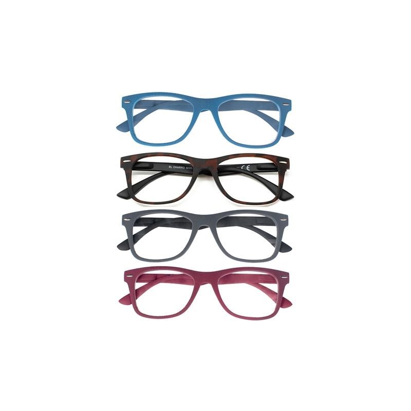Occhiali per lettura. Aste flessibili. Montatura con rilievi tridimensionali, sensibili al tatto. Lenti asferiche, sottili e infrangibili, con trattamento antigraffio e antiriflesso. Confezione da 4 pz (blu, tartaruga, grigio e rosso). Modello = correzione diottrie