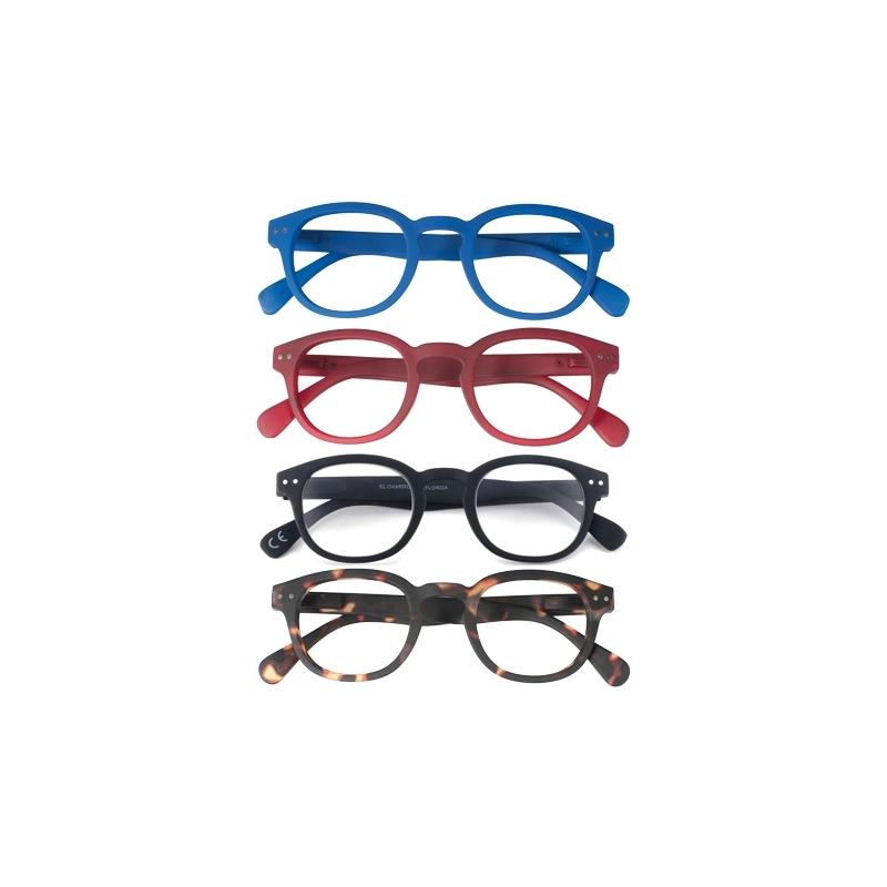 Occhiali per lettura. Aste flessibili. Lenti asferiche, sottili e infrangibili, con trattamento antigraffio e antiriflesso. Confezione da 4 pz (blu, tartaruga, nero e rosso). Modello = correzione diottrie
