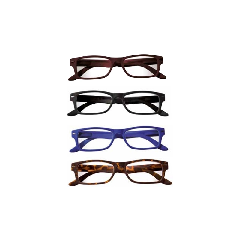 Occhiali per lettura con montatura con colori unisex. Aste flessibili con meccanismo a molla. Rivestimento soft touch effetto gomma. Pins sul frontale. Modello = correzione diottrie/colore
