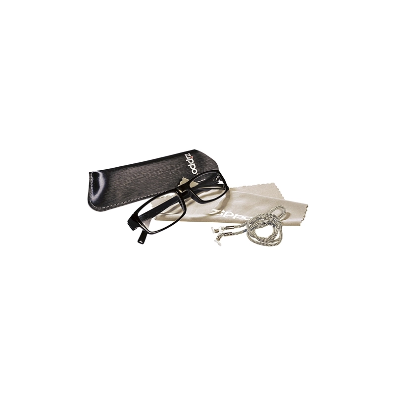 Custodia nera satinata per occhiali da lettura con pezzuola in microfibra e cordino.