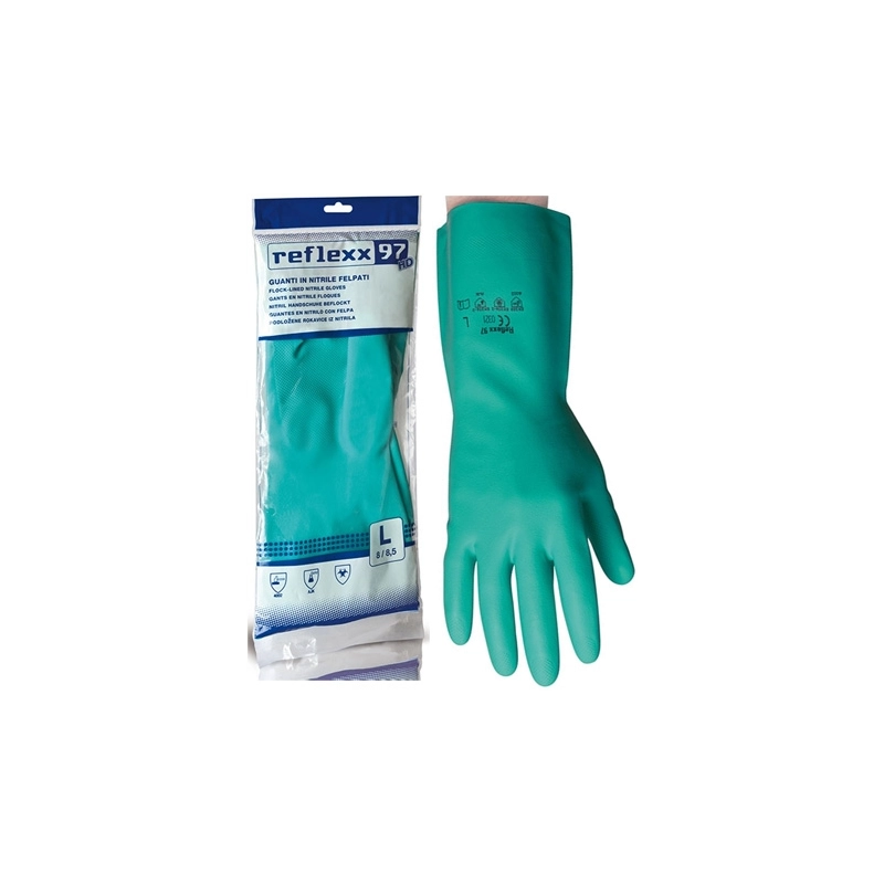 Guanti riutilizzabili in nitrile con leggera felpatura interna. Clorinati esternamente, zigrinatura antiscivolo. Ottima resistenza chimica (polivalente) e meccanica (abrasione e perforazione). Certificato per uso alimentare. AQL 1,5. Spessore mm 0,40. Lunghezza 33 cm. Colore verde. Taglia M