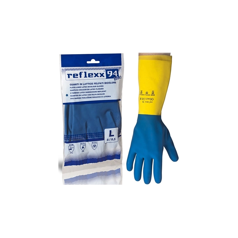 Guanti in lattice riutilizzabili senza polvere bicolore giallo e blu. Doppio strato di lattice per una maggiore resistenza su palmo e dita. Clorinati esternamente, zigrinatura antiscivolo. Felpatura interna in morbido cotone. AQL 1,5. Spessore mm 0,5. Lunghezza 33 cm. Taglia S