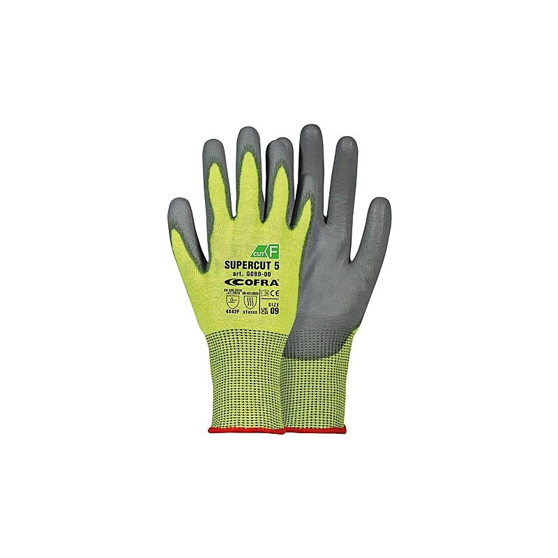 Guanto con palmo in poliuretano, fodera FIBERGUARD. Ottima destrezza e protezione al taglio F, con un elevato livello di flessibilita' e traspirabilita'. Manipolazione oggetti caldi fino a 100 gradi C. Colore grigio - lime. EN 388:2016-4X42E. Modello = taglia