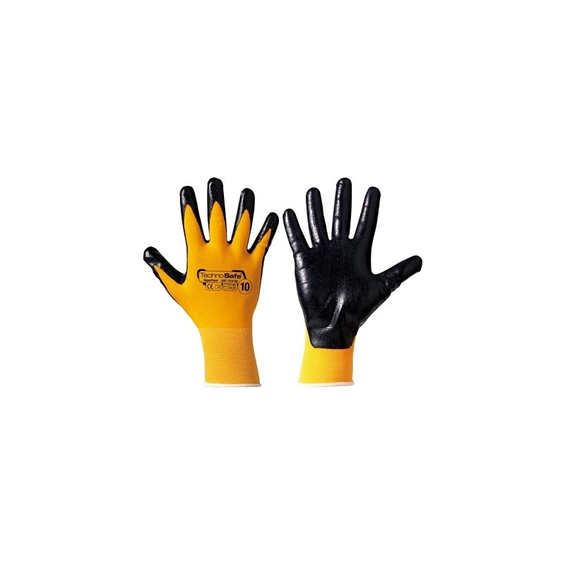 Guanti in filo continuo nylon, senza cuciture. Palmo ricoperto in mescola foam di nitrile, polso elasticizzato, dorso areato. Taglia 8